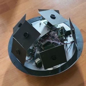 Beside the cameras, the dome contains a power supply and an ethernet switch for each camera. Each camera has a black paper baffle. The dome is painted from the inside with two color layers - silver outside and pale black inside. That reduces internal reflections and the thermal influx.
